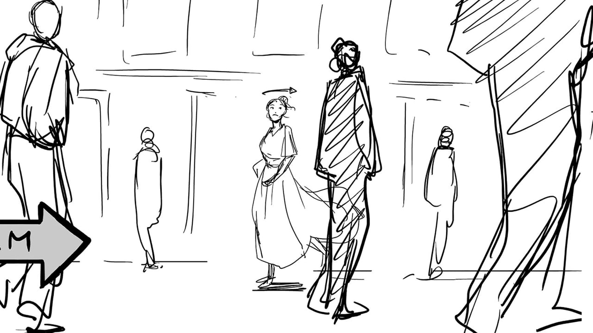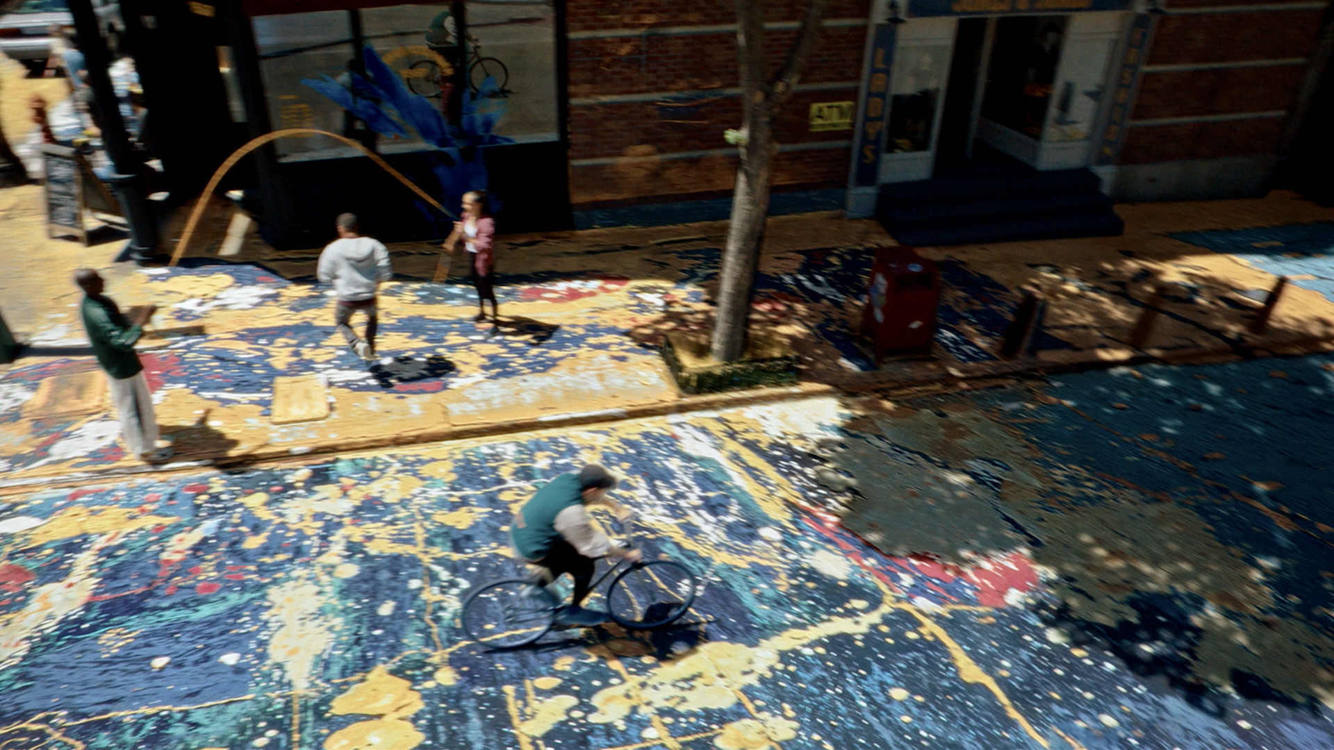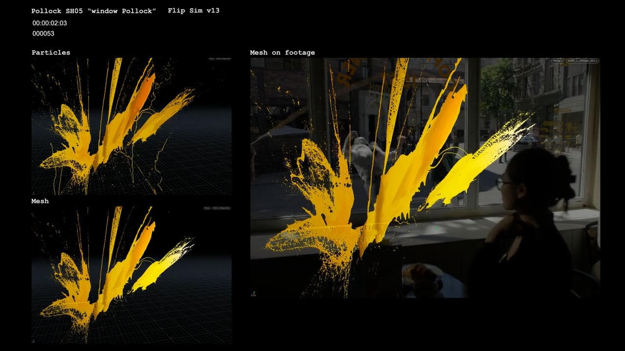 For Jackson Pollock, we followed the same approach as with Degas, but what interested us most was his work around gesture, especially his iconic dripping technique. We explored this idea throughout many of our scenes, letting traces of movement, rhythm, and layered compositions subtly echo his visual language without illustrating it in a literal way.