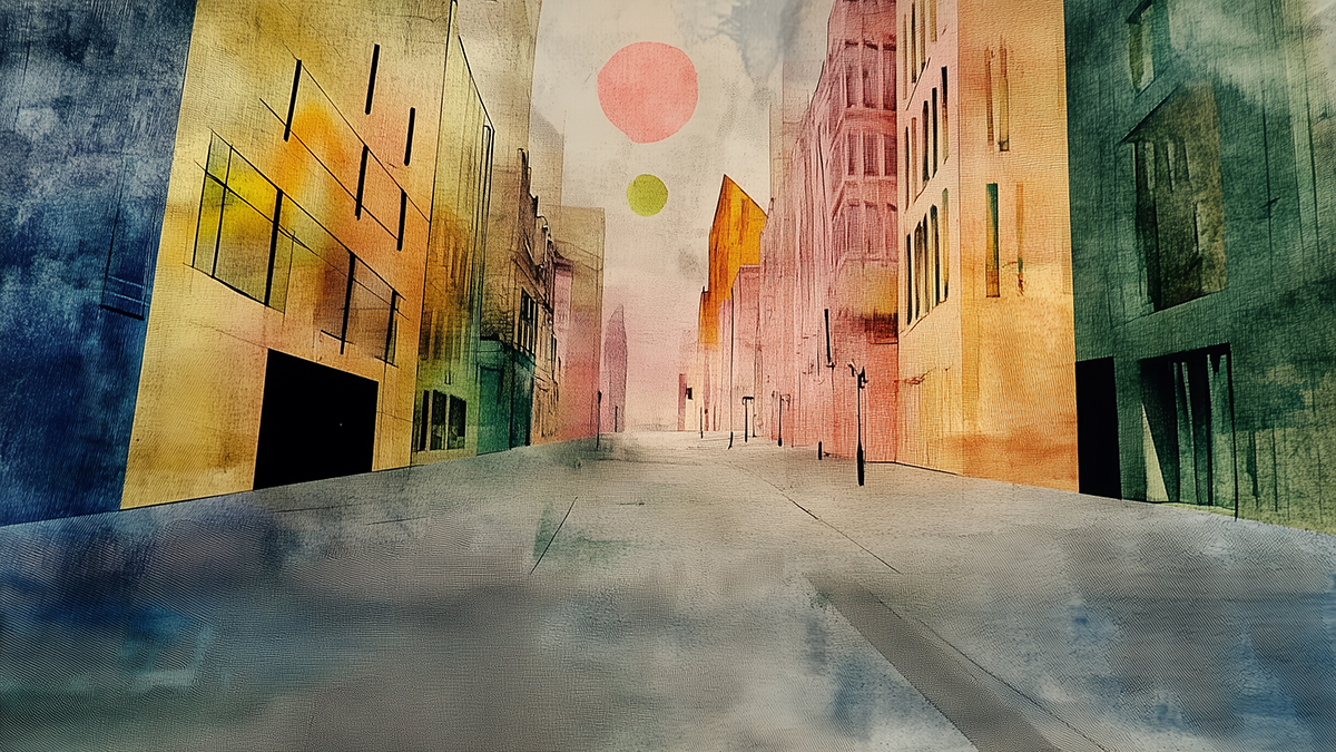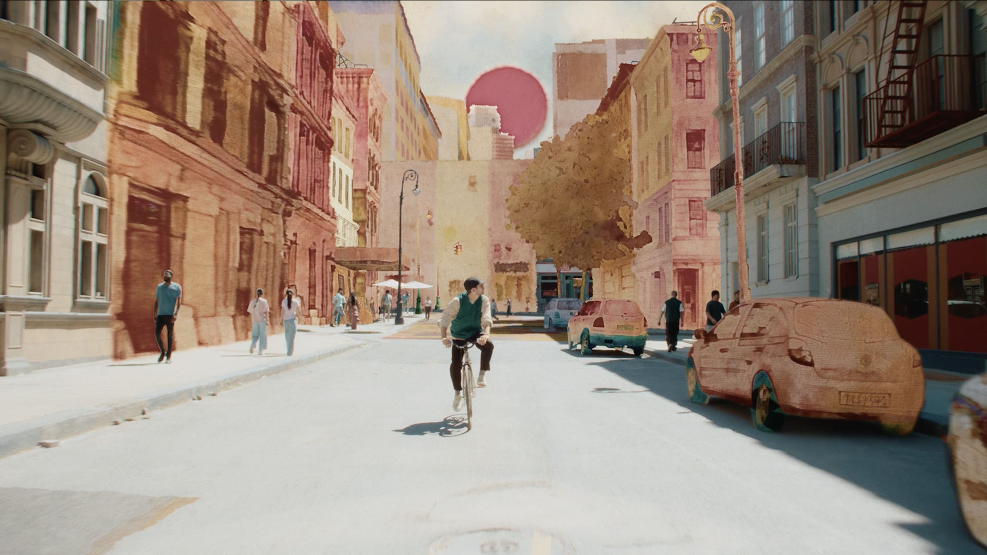 For Paul Klee, what drew us to his work was the sense of faceting, those flat planes of color building geometric, vibrant landscapes.We translated this language into our urban world: our protagonist, riding his bike, becomes immersed in a city that fragments and reorganizes itself around him, transforming into a colorful, graphic urban canvas.