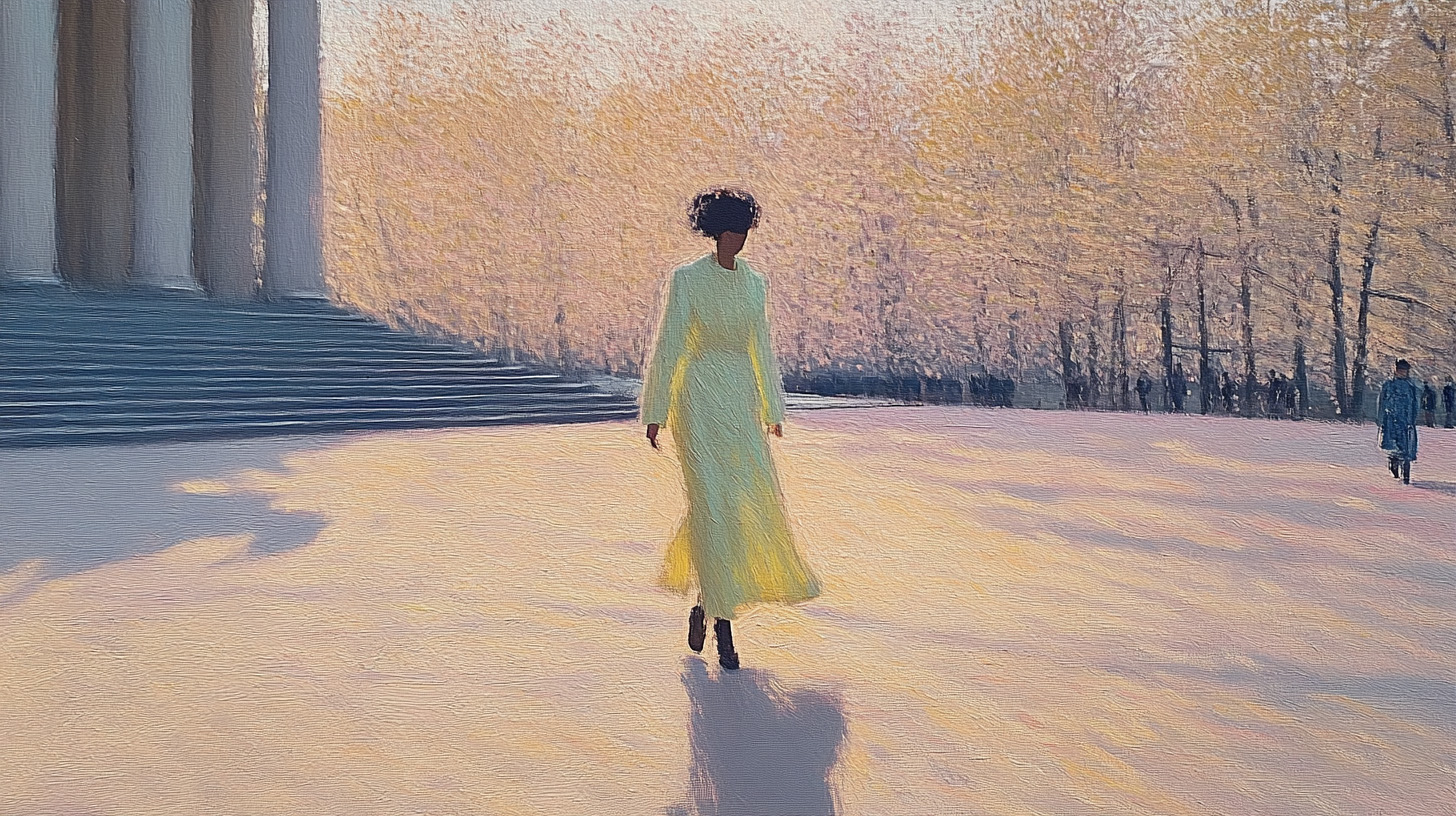 Finally, Claude Monet, master of sensitivity and light across natural landscapes.What better way to close the film than with one of his iconic paintings, set against a Venetian sunrise? We carried the painting’s tones into every detail. Even the styling of our protagonist, ensuring that no chromatic note would disrupt this final canvas.